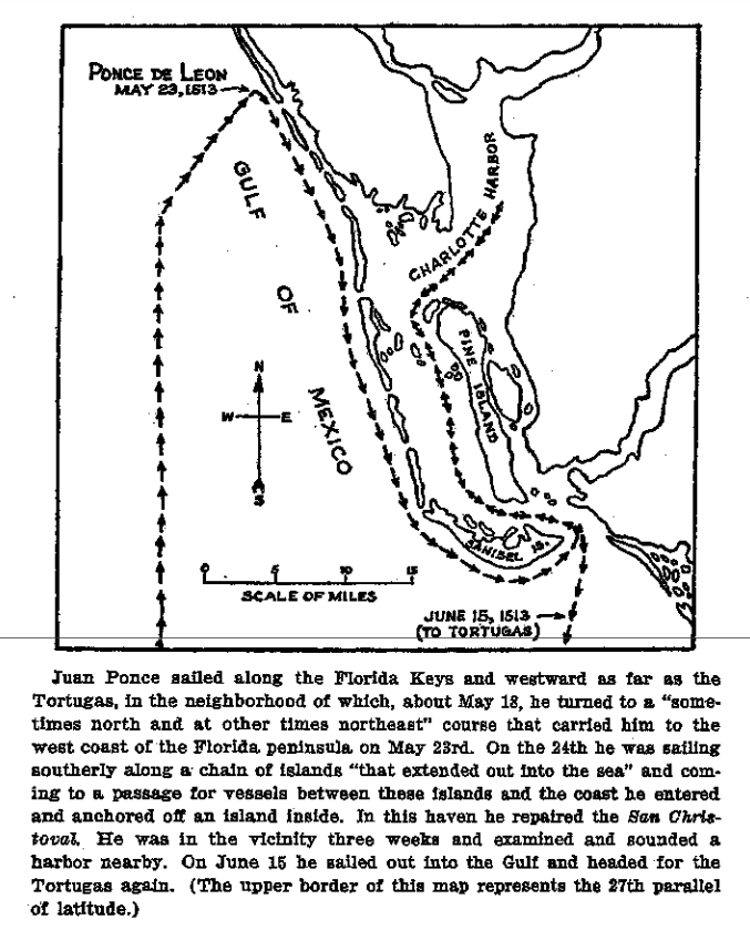 “After his discovery of La Florida in 1513, he proceeded to sail south along the coast and rounded the peninsula and headed north to beyond “some islands which jutted out into the sea”. Some historians believe those we near Tampa Bay, but most believe they were Sanibel and Captiva. The expedition turned south and sailed along Sanibel beach and through the shoals into San Carlos Bay. They then turned north and sail up through Pine Island Sound, at last dropping anchor along Pine Islands northwestern shore. Ponce de Leon and his men spent the next 21 days on Pine Island in search of rumored treasure.”